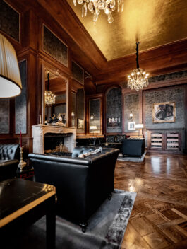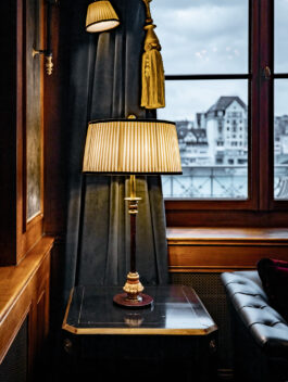 Die Neugestaltung der Bar im Grand Hotel LES TROIS ROIS sorgt für eine besondere Atmosphäre. Eine neue textile Bespannung der Wandfüllungen, die Leuchten und das angepasst- maserierte Holzwerk verleihen der Bar eine harmonische Stimmung.
