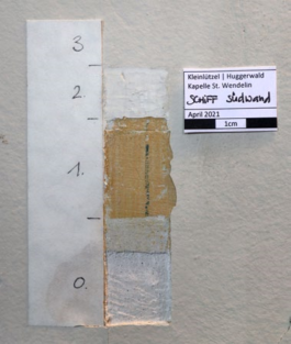 Weitere Farbuntersuchungen ergaben für die Wandflächen im Kappellenschiff einen gelborangen und im Sockelbereich einen ockernen Farbton. Im Altarraum waren die Wandflächen einst grün und der Sockelbereich dunkelgrün gestrichen. Die Untersuchung an den Decken bestätigte, dass die heruntergehängte Gipskartonplatte bei der Restaurierung in den frühen 1980er Jahren montiert worden war. Aufgrund dieser Befunde fiel der Entscheid, Schiff und Altarraum nach der Reinigung der Wände und den Ausbesserungen am Verputz mit einer differenzierten Farbigkeit zu streichen, um den stimmungsvollen Kirchenraum zurückzugewinnen. Mit Bezug auf die Farbgestaltung vor 1982/1983 sollten Sockel- und Fenstereinfassungen durch einen Begleitstrich abgesetzt werden. Die Decke wurde gewaschen und weiss gestrichen.