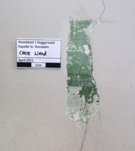 Die Schadensanalyse der Restauratoren stellte – nebst einer «normalen» Verschmutzung der Architekturoberflächen – über den gesamten Kirchenraum verteilte feine Risse, Abplatzungen und Loslösungen der Malschicht fest. Besonders stark waren die Schäden im Sockelbereich, die vermutlich von der aufsteigenden Feuchtigkeit im Mauerwerk herrührten. Die einstige Farbigkeit in der Kapelle war aufgrund von Fotoaufnahmen aus der Zeit vor der letzten Restaurierung 1982/1983 bekannt. Die visuellen Untersuchungen und die mechanisch ausgeführten Sondierungen durch die Restauratoren lieferten jedoch kaum Befunde zur früheren Ornamentik. Einzig in der Fensterleibung konnte ein Bruchstück der einstigen ornamentalen Gestaltung nachgewiesen werden.